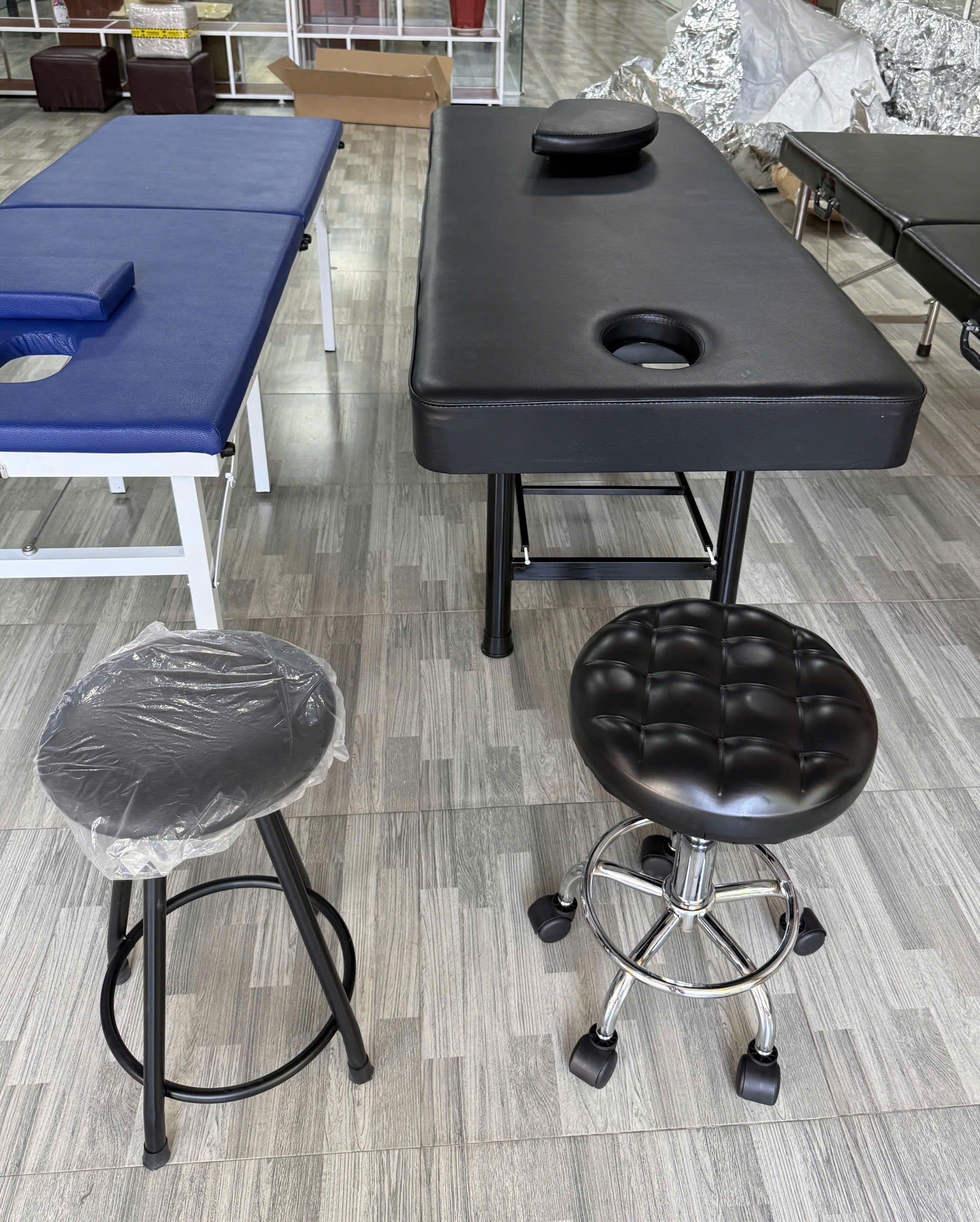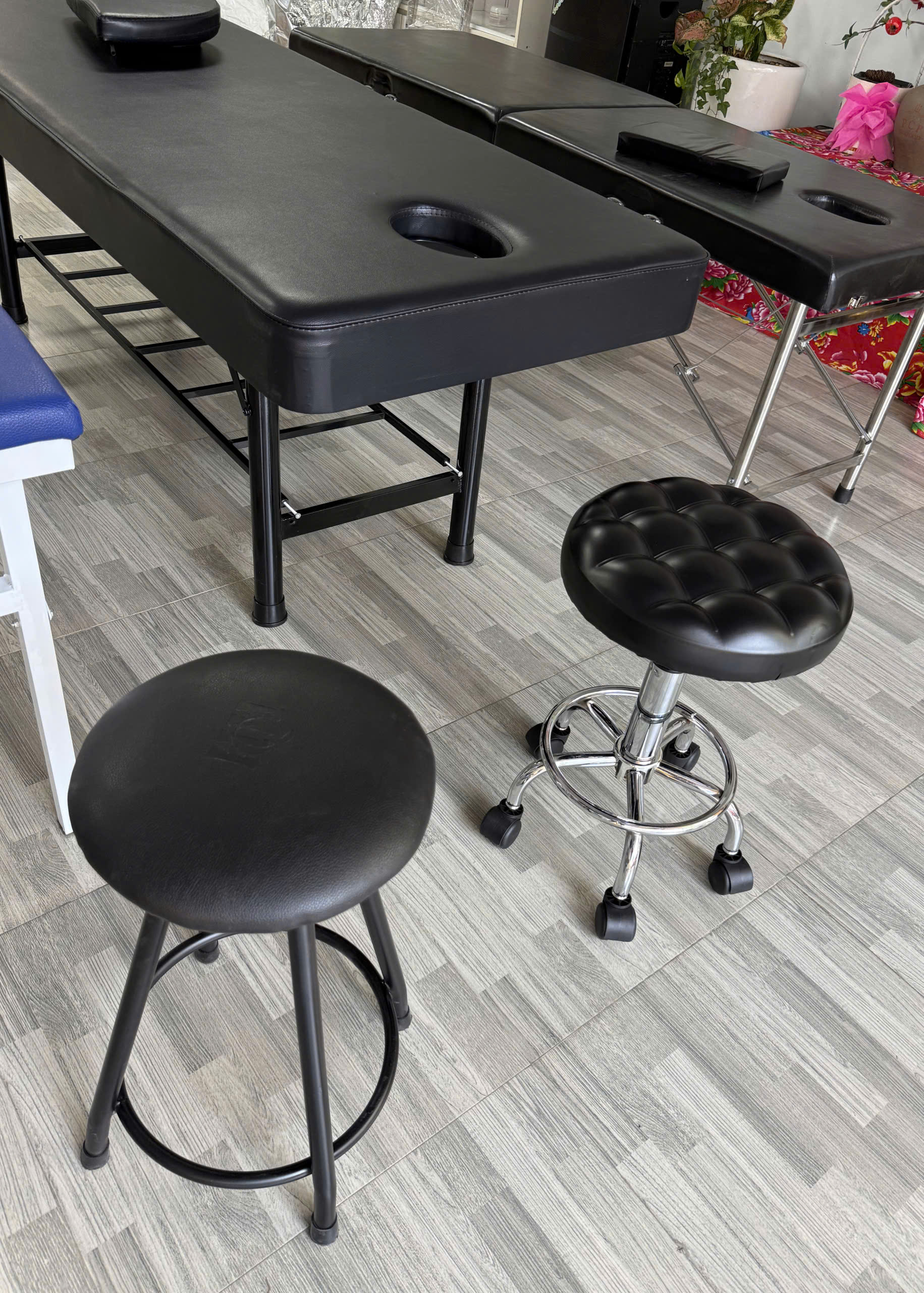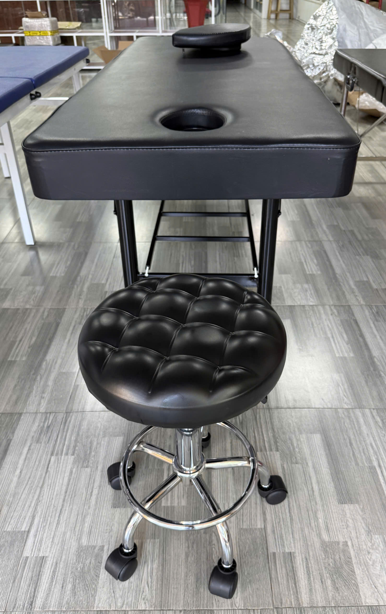 Ghế được làm bằng inox cao cấp và đệm được bọc bằng da tổng hợp, tạo cảm giác mềm mại và ít bị bám bụi bẩn, thích hợp với môi trường spa, massage trị liệu và đẹp bằng điện sinh học DDS.