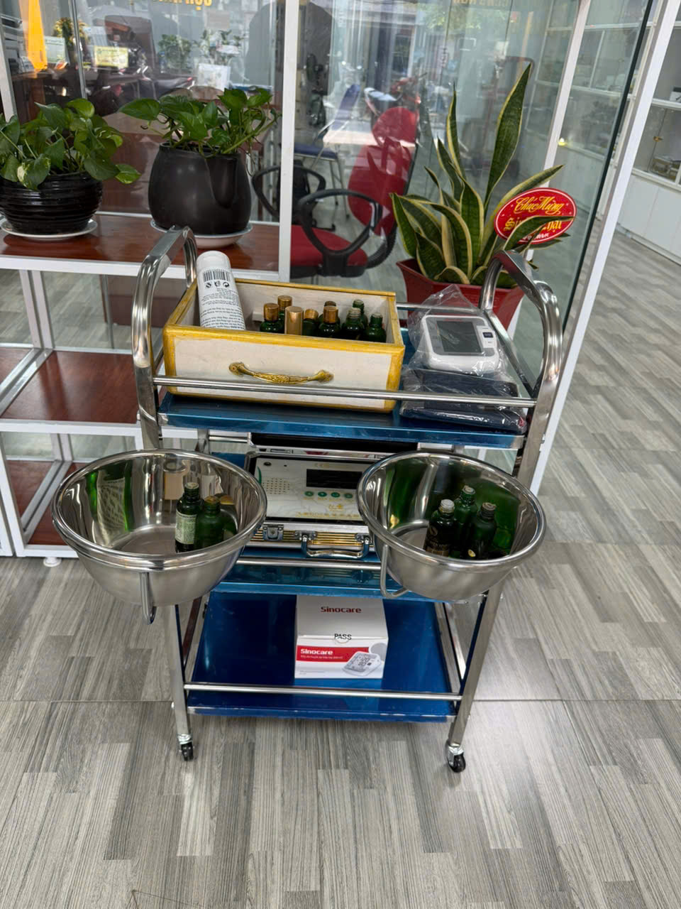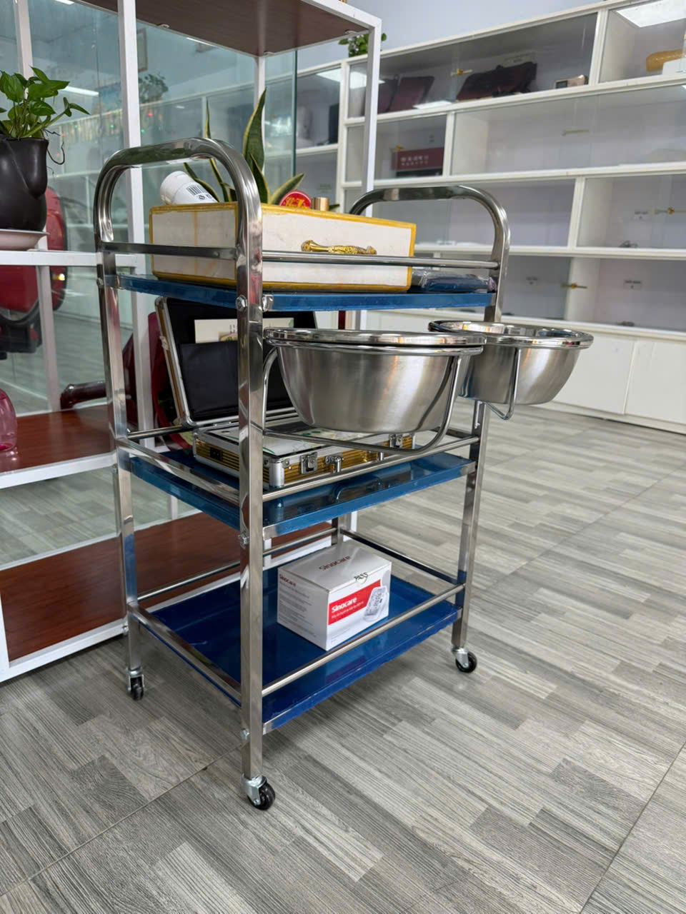 - Xe còn có hai bát inox đựng các đồ nhỏ rất tiện lợi, đặc biệt phù hợp với công việc massage, spa trị liệu và làm đẹp bằng điện sinh học DDS.