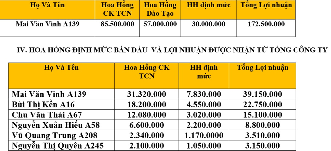 III. HOA HỒNG ĐỊNH MỨC BÁN MÁY VÀ LỢI NHUẬN ĐƯỢC NHẬN TỪ TỔNG CÔNG TY