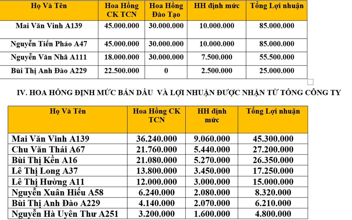 III. HOA HỒNG ĐỊNH MỨC BÁN MÁY VÀ LỢI NHUẬN ĐƯỢC NHẬN TỪ TỔNG CÔNG TY