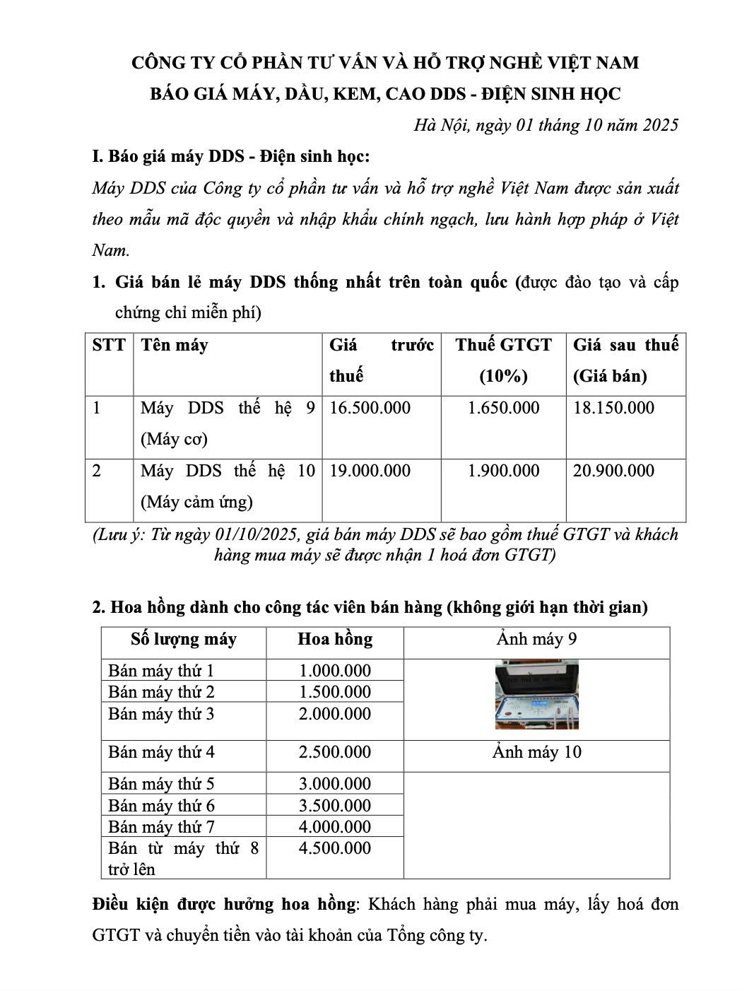 Từ ngày 1/10/2025, công ty sẽ điều chỉnh giá máy DDS bao gồm cả thuế giá trị gia tăng VAT. Điều này làm tăng thêm giá trị và khảng định tính hợp pháp của máy DDS chỉ có ở công ty cổ phần tư vấn và hỗ trợ nghề Việt Nam. Video dưới đây phân tích rất rõ về điều này. Mời quý vị cùng xem.