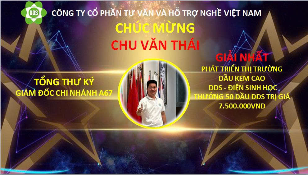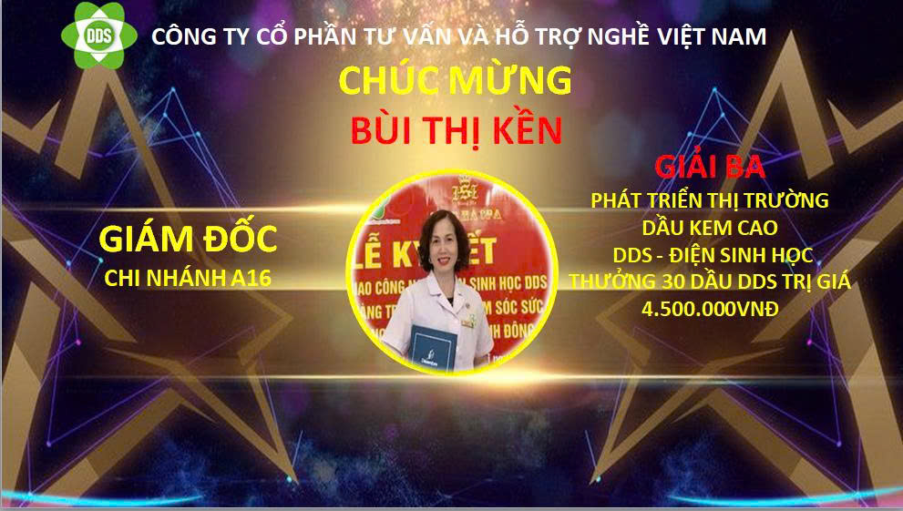 Để ghi nhận thành tích cá nhân trưởng chi nhánh đạt giải phát triển thị trường bán dầu, kem, cao DDS, công ty dựa vào số lượng dầu, kem, cao mà các trưởng chi nhánh mua trực tiếp tại văn phòng tổng công ty. 3000 lọ/hộp: đạt giải 3, 4000 lọ/hộp: đạt giải nhì, 5000 lọ/hộp: đạt giải nhất. Dưới đây là danh sách các trưởng chi nhánh đạt giải. Công ty xin chúc mừng các cá nhân đạt giải năm 2025.
