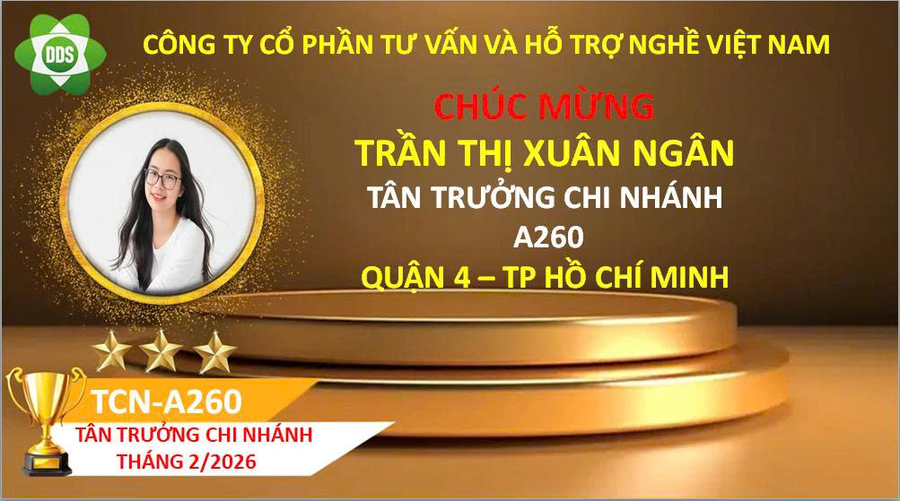 2. Công ty chúc mừng Chị Trần Thị Xuân Ngân - Trưởng Chi Nhánh A260 ( Quận 04 - TP HCM) đứng trong hàng ngũ lãnh đạo của công ty và được Tổng công ty tặng thưởng 1 máy DDS thế hệ 10 trị giá 19.000.000 đ