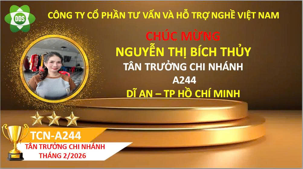 3.Công ty chúc mừng Chị Nguyễn Thị Bích Thuỷ - Trưởng Chi Nhánh A244 ( Dĩ An - TP HCM) đứng trong hàng ngũ lãnh đạo của công ty và được Tổng công ty tặng thưởng 1 máy DDS thế hệ 10 trị giá 19.000.000 đ